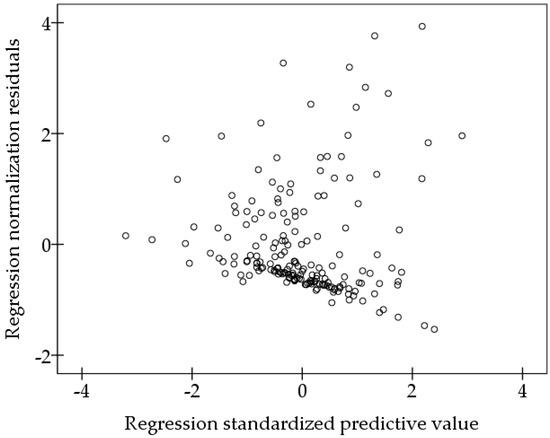 The standard residuals need to satisfy the requirements of randomness and normality to prove the correctness of the obtained formula. The following results were obtained by analyzing the standard residuals. Figure 9 illustrates the corresponding statistical analysis of the residuals of Equation (13) and the histogram of the residuals with normal probability curve; the residuals present a normal distribution. The 95% distribution of standardized residual is between −2 and +2, which suggests that the model assumptions are reasonable. Figure 10 shows the scatter plot of the standardized residual.