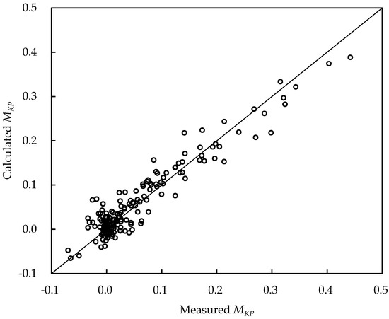 where R2 is the coefficient of determination, K is the size of the data set, J is the number of dimensionless independent variables, and yk is the measured value of MKP. Here, is the estimated value of MKP of Equation (13), and is the mean value of yk.