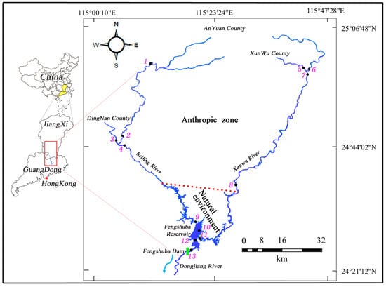 Map showing the sampling sites in the river system (Beiling River (S1–S4), Xunwu River (S5–S8)) and reservoir system (Fengshuba Reservoir (S9–S13)).