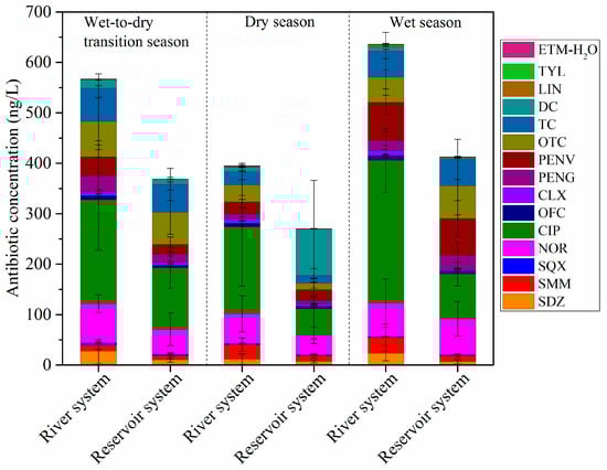 Accumulated concentrations of antibiotics in the river system (S1–S8) and reservoir system (S9–S13) over the three seasons. Error bars represent standard error of the mean.