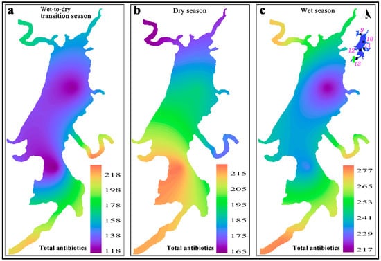 Contour maps showing the spatiotemporal distributions of total antibiotics in the sediment phase of FSBR (μg/kg). (a) Wet-to-dry transition season. (b) Dry season. (c) Wet season.