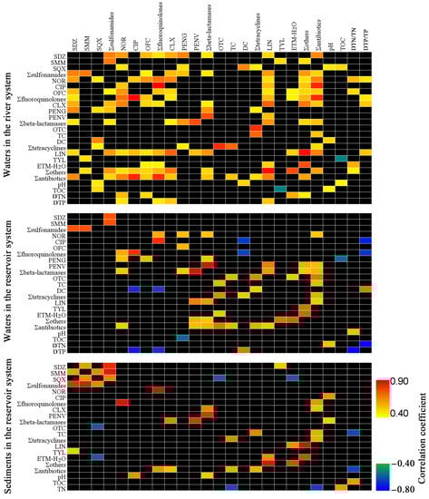 Pearson’s correlation coefficients for antibiotic concentrations and basic parameters in the water and sediment samples in the river-reservoir system (p < 0.05). Bottom right shows the color band indicator of the correlation coefficient. Black boxes and no box shown in each line in the figure delineate no significant correlation for corresponding parameters (p > 0.05).