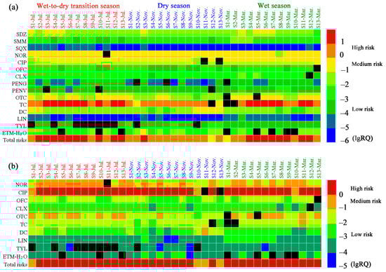 Calculated risk quotients (RQs) for the detected antibiotics in the water samples with the three seasons. (a) Ecological risk of the antibiotics on the typical taxons. (b) Ecological risk of the antibiotics on the selection for resistant bacterial. Bottom right shows the color band indicator of the level of ecological risk based on a log scale. Black boxes delineate no ecological risks due to the corresponding antibiotics undetected.