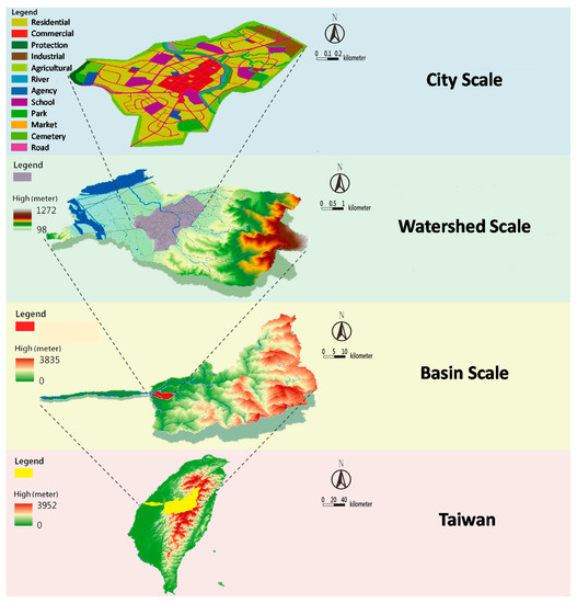 From the aforementioned literature review, runoff variations and mitigation in response to land-use and land-cover changes caused by urbanization have been widely studied. However, depending on the research objective, most studies have analyzed the phenomenon either on a large basin scale or on a small city scale by using specific land data and hydrological models. An overall study of the influences of urbanization on runoff across data, models, and scales has not been conducted. Therefore, certain questions require to be answered, for example, (a) is it appropriate to mix land-cover and land-use data for hydrological analysis? (b) how do hydrological models affect runoff results when the same land data are input? and (c) how do LID approaches benefits flood mitigation on different spatial scales? The purpose of this study is to assess and cross-analyze land and runoff changes on basin (large), watershed (medium), and city (small) scales in the Zhuoshui River Basin in Taiwan. On the basin scale, the historical land-cover and runoff changes are analyzed through the classification of satellite images and the application of the HEC-1 model. On the watershed scale, sub-basins with a higher degree of urbanization are pinpointed, and the results from the other two scales are accumulated and cross-analyzed. On the city scale, runoff changes under present and future land-use scenarios with and without LID measures are quantified through the application of SWMM. The procedure enables a comprehensive test of the applicability and limitation of relevant methodologies and provide valuable information for future studies.