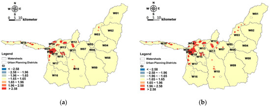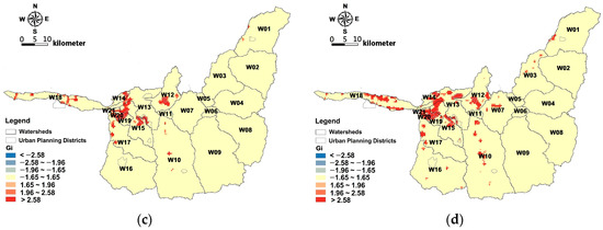 The urbanization level is measured by determining whether an aggregation of artificial structures is present in the Zhoushui River Basin through Spatial Autocorrelation Analysis (SAA) [39] and Spatial Hotspot Analysis (SHA) [40]. The SAA uses the Moran’s I and Z-score [41] as indexes to estimate the significance of homogeneity in structure distributions. If an area has a value of Moran’s I > 0 with a Z-score > 1.96, the hypothesis of structure aggregation will be accepted under 5% of significance level. Once the SAA confirms the pattern of structure aggregation, the SHA employs the G i index defined by Getis and Ord [42] to determine the hotspots of these artificial structures. The more the G i exceeds 0, the higher the structure aggregation level in an area.