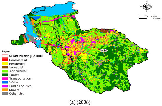 Land-cover and land-use data are different in acquisition and usage. Land cover refers to the area ratio of a region covered by forests, agricultural land, water bodies, or other types of landscapes, whereas land use refers to how an area is used by people (e.g., building, conservation, park). Land-cover changes are usually determined by interpreting multi-period satellite images or remote-sensed data assisted by spatial analysis tools such as GIS (Geographical Information System) for map overlaying [5,6]; this is cost-effective and thus suitable for periodically updating hydrological parameters on a large scale [7,8,9]. Land-use changes cannot be determined from image processing but are determined from a filed survey or the investigation of environmental, economic, and social activities [10,11,12]. Thus, land-use data are often localized and related to policies regulating human activities on a small scale [13,14].
