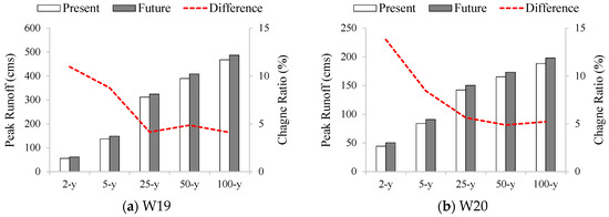 Figure 4. Present and future runoff peaks on watershed scale for (a) W19 and (b) W20.