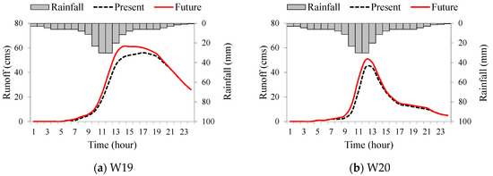Figure 4 shows a comparison of present and future runoff peaks under different return periods for W19 and W20, respectively. Peak runoff are demonstrated to increase in the future under all return periods for both W19 and W20. Although the increments of peak runoff are smaller at low return periods, their change ratios are instead larger. For both watersheds, the peak runoff under 2-y return periods increase by more than 10% and then drop to a level of 5% under return periods larger than 25 years. The runoff hydrographs under 2-y return period for W19 and W20 are displayed in Figure 5, showing that future runoff peaks not only increase but also shift forward; the integration of runoff hydrographs against time shows that the total increases in runoff volume are 212,400 m3 and 140,400 m3 for W19 and W20, equivalent to 85 and 56 standard swimming pools, respectively. Such an increase presents a non-negligible extra risk of flooding if additional flood control measures are not implemented.
