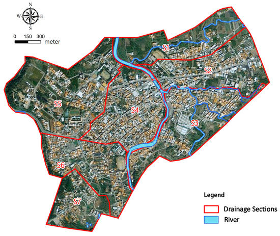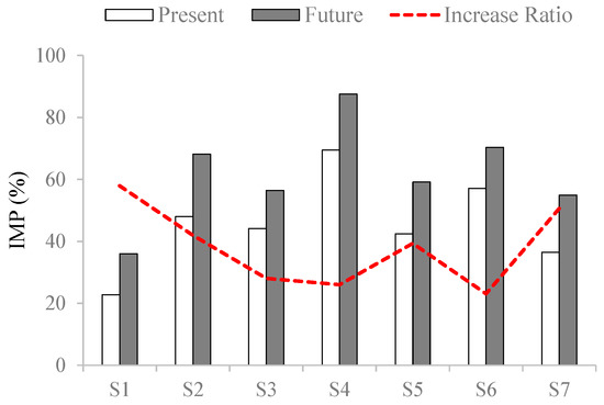According to the sewer system report for Jushan in 2008 [48], the Jushan District is divided into seven drainage sections as shown in Figure 6 and the land-use maps for these sections at present and in the future are compared in Figure 7. The figure indicates that, by 2030, the commercial area will greatly expand and will be mostly concentrated in S4; a large industrial block will be developed at the borders of S1 and S2; and the residential areas will be increased in almost every section. Figure 8 indicates that the IMP for all the seven sections increase simultaneously, from 23–69% at present to 36–88% in the future, in which the S1 has the highest increase of 58 % . The variations of average IMP and Q p 100 on the city scale are also listed in Table 8, which shows that this increased IMP will raise Q p 100 from 79.62cms to 84.26cms by 2030. Table 9 summarizes the parameters for SWMM.
