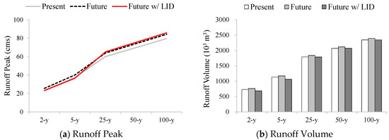 Figure 9. (a) Runoff peak and (b) runoff volume for different return periods under land-use scenarios of present, future, and future with LID.