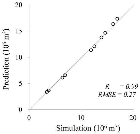 Figure 10. Comparison between the simulated and predicted runoff volumes on watershed scale.
