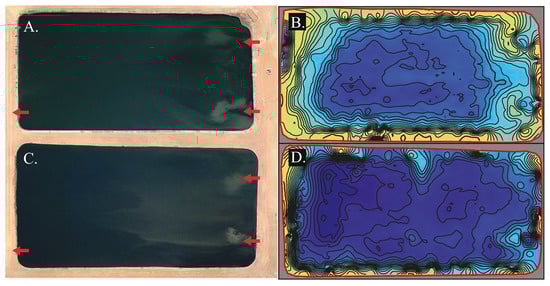 Aerial view of the study site, and the sludge profiles in each pond in 2015. (A) Pond 1 and (B) its sludge profile (45% infill), and (C) Pond 2 with (D) its sludge profile (29% infill). Sludge accumulation in these ponds is mostly around the edges, along with a bench in front of the inlets; the inlets and outlets indicated by red arrows (A, C). For tracer testing, the dye was added at into the northern inlet only.