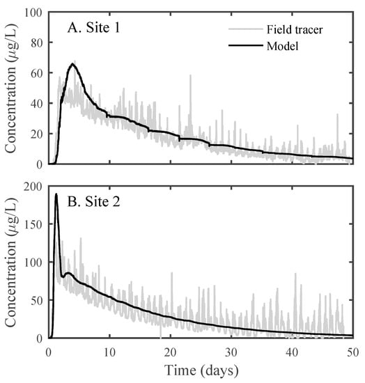 The agreement between signals of concentration at the pond outlet from the calibrated model and field tracer testing is strong across two sites (Figure 2). All models were set-up to run for 91.5 days with a 1 s time step, including a 5 days warm-up period to reach steady state and 86.5 days of tracer simulation.