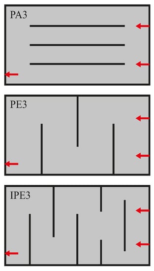 Selected examples for each baffle configuration from the 15 baffle scenarios modelled for the study site (Table 1). Note: PA = parallel, PE = perpendicular, and IPE = island perpendicular. PA3 shows three baffles parallel to the inlet flow, PE3 shows three baffles placed perpendicular to the flow, while IPE3 shows an island baffle configuration followed by three perpendicular baffles. The ponds at the study site both have twin inlets and one outlet, as shown by red arrows.