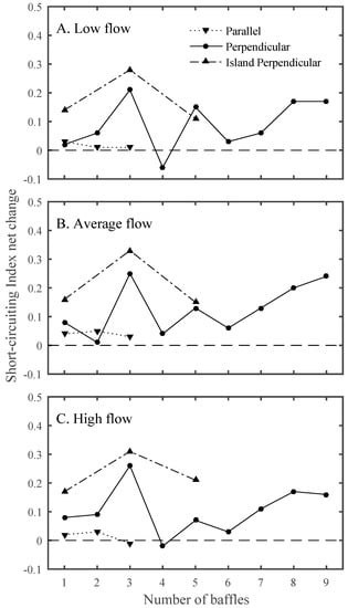The net change in the short-circuiting index for each baffle configuration modelled under: (A) low, (B) average, and (C) high flow conditions. The dotted line (0) represents the baseline no-baffle scenario. For all flow scenarios, except PE4, the net change is positive, indicating that the addition of baffles decreases short-circuiting in this pond. IPE3 and PE3 configurations consistently provide the greatest improvement, while all parallel configurations provide little improvement.