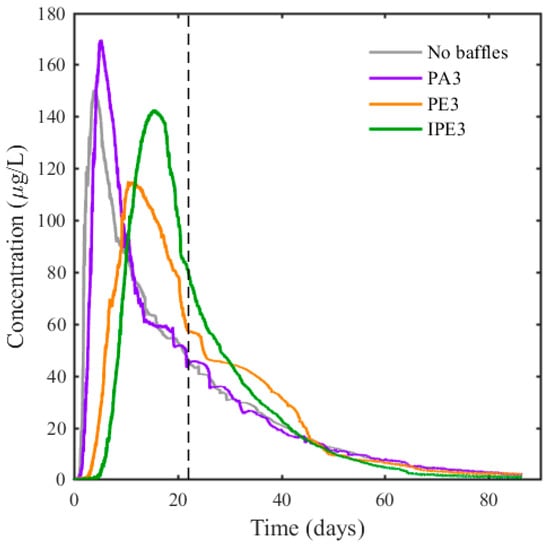Modelled residence time distribution (RTD) of the non-baffled scenario compared to PA3, PE3, and IPE3 under average flow conditions, all with a sludge volume of 21.5%. The black dotted line represents tn for this flow condition. The RTD with parallel baffles (PA3; purple) is not vastly different from the non-baffled scenario (grey), both with high concentration peaks early on. The addition of perpendicular baffles (PE3; orange) not only delays the initial peak but also reduces the peak concentration, while the island baffle configuration (IPE3; green) also delays the initial peak and moves the RTD closer to that expected in plug flow. The RTDs for the PE3 and IPE3 configurations both show that short-circuiting in the pond has been reduced.