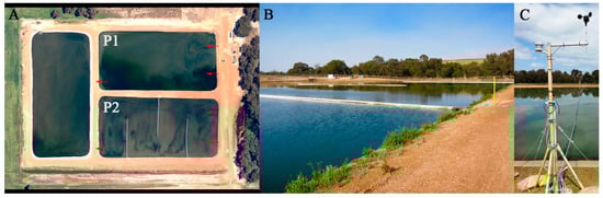 The study site is located in a town 86 km south of Perth, Western Australia, and experiences a Mediterranean climate with yearly average temperatures ranging between 10–30 °C, and an average rainfall of 690 mm []. The site was selected specifically to have two parallel primary facultative ponds, referred to as Pond 1 (used as the reference system; Figure 1A) and Pond 2 (the trial system; Figure 1C). These ponds evenly share a total inflow of up to 770 kL·day−1. Each pond has dimensions 120 m × 60 m × 1.3 m, with two inlets, and one outlet (Figure 1). The total treatment capacity/volume of each pond without any sludge accumulation is 9360 m3, and under average flow conditions the nominal residence time (tn) in each pond is 28 days.