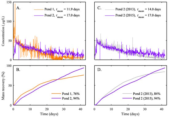 Residence time distributions (RTD) and mass recovery of the field tracer tests on Ponds 1 and 2 in 2013 and 2015, each over a 42-day period. (A) RTDs in 2015 tracer study. Pond 1 (no baffles; orange) experiences a much higher concentration peak earlier than in Pond 2 (purple), indicative of a higher level of short-circuiting. (B) Field tracer mass recoveries of Pond 1 (orange) and Pond 2 (purple) in 2015, where 76% and 94% of the mass released had been recovered at end of the monitoring period, respectively. (C) Tracer response in Pond 2, before (2013) and after (2015) baffle installation. Residence time has increased by at least 20% due to baffle installation. (D) Mass recovery from Pond 2, pre- and post- baffle installation, where recovery has increased by 10%. Overall, the baffles appear to attenuate concentration fluctuations, decrease short-circuiting and the presence of dead zones, and increase residence time.