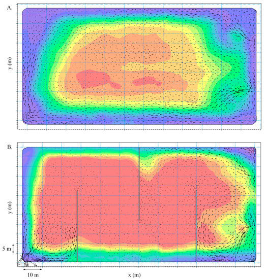 Hydrodynamic model flow output plots for (A) Pond 1 with 45 % sludge infill, and (B) Pond 2 with 29% sludge infill. Installing perpendicular baffles in Pond 2 changed the flow within the pond significantly, particularly near the inlets, and directed the flow through the entire pond volume. Grid spacing shown is 10 m in x and 5 m in y.