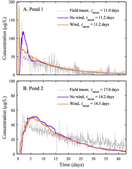 Wind influence on the baffled Pond 2 is shown in Figure 9B. In the no wind scenario (Figure 9B; purple) the model predicts the peak value of the tracer output relatively well; however, it predicts a later peak. With the addition of wind into the Pond 2 model (Figure 9B; orange) there is very little change from the no wind scenario, with no change in the overall shape of the distribution, peak, nor the timing of the peak. The tmean calculated for no wind and wind scenarios are 14.2 and 14.5 days respectively. For both scenarios, the model does not appear to capture the same gradual decrease in tracer concentration as shown in the field measurement. Overall, the results for Pond 2 show that baffles attenuate any major hydrodynamic influence of wind.