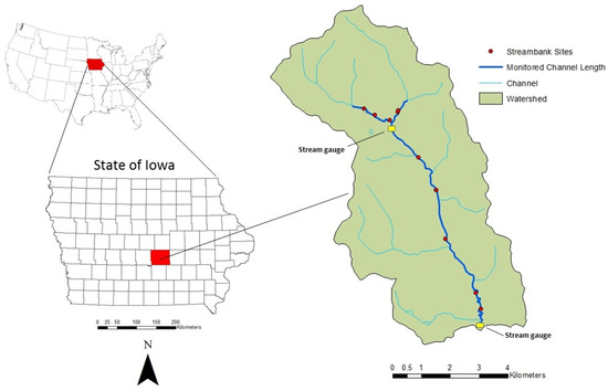 Location of watershed, monitored channel length, and streambank sites, Walnut Creek, Iowa, USA.