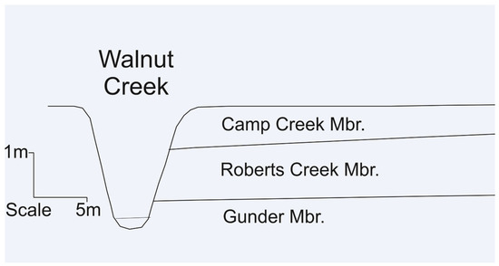 Walnut Creek’s floodplain is comprised of a series of loess-derived Holocene alluvial deposits, collectively known as the DeForest Formation [45]. The formation is divided into members based on lithologic properties (e.g., color, texture, pedogenic alterations). Three primary members of the DeForest Formation comprise Walnut Creek’s streambanks (Figure 2 and Figure 3).