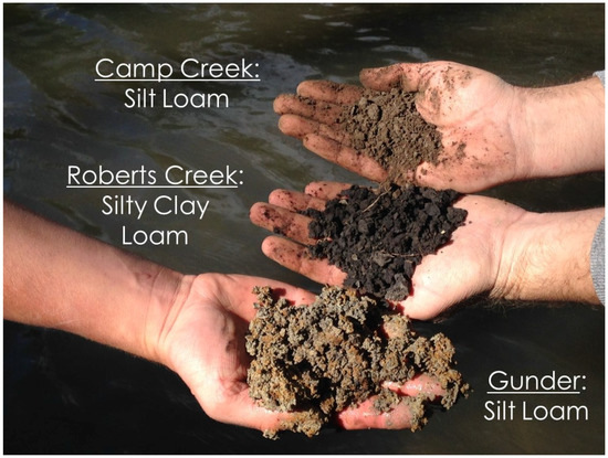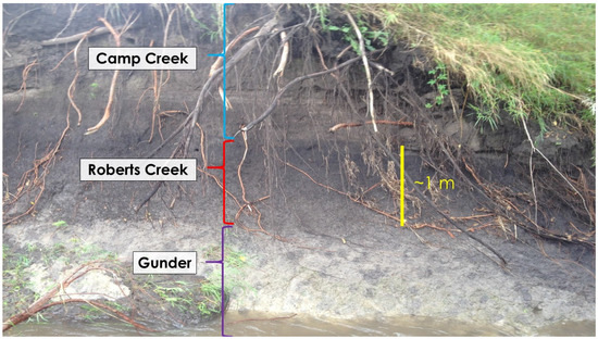 The Camp Creek member overlies the Roberts Creek and represents the upper stratigraphic position (i.e., floodplain surface) (Figure 3). Camp Creek was deposited during the last ~400 years [46], and is typically referred to as ‘post-European settlement alluvium’. Camp Creek is described as a silt loam, with fine granular structure, light color, and the highest silt content of the three members (Figure 4). Thickness of the Camp Creek ranges from 0.6 to 1.8 m [27]. Camp Creek is heavily stratified, with abundant striations resulting from layering during floods. For this paper, the terms ‘alluvial unit’ and ‘member’ will be used interchangeably.