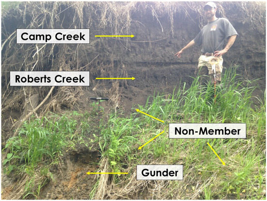The Roberts Creek member overlies the Gunder (Figure 3), and is described as a silty clay loam [27] (Figure 4). Deposition occurred ~3500–500 ybp, in the context of a tallgrass prairie-savanna dominated landscape [46,49]. The Roberts Creek represents the pre-Euro-American settlement landscape surface, and exhibits a relatively high organic matter content [27], and well defined subangular blocky structure. Flow regime during deposition was typified by smaller, less intense streamflows [49], which resulted in the Roberts Creek having the greatest clay content of the three members.