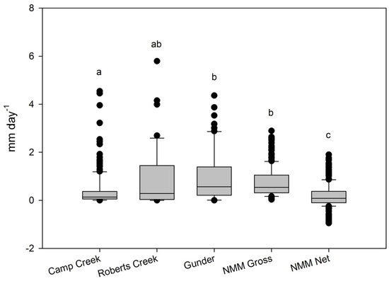 No significant difference (p value < 0.05) in mean daily erosion rate was detected between Roberts Creek (0.89 mm day−1), Gunder (0.99 mm day−1), and NMM Gross (0.74 mm day−1) (Figure 7). The Camp Creek mean recession rate (0.39 mm day−1) was significantly lower (p value < 0.05) than Gunder, and NMM Gross, but not significantly different to Roberts Creek. The mean daily recession rate of NMM Net (0.19 mm day−1) was found to be significantly lower than all alluvial units, as well as NMM Gross. As noted in the methodology, NMM Net was the only unit to include negative recession rates (i.e., deposition).