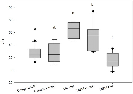 The Gunder and NMM Gross represented the greatest cumulative lateral recession over the study duration (64.1, 53.1 cm, respectively) (Figure 8). Gunder and NMM Gross were found to be significantly greater (p value < 0.1) than Camp Creek (26.8 cm), Roberts Creek (27.3 cm), and NMM Net (15.5 cm). No significant difference was detected between Camp Creek, Roberts Creek, and NMM Net (p value < 0.1).