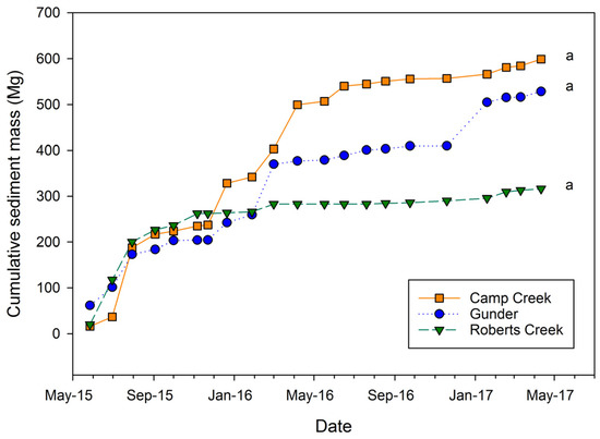 Cumulative mean sediment mass loss for Camp Creek, Roberts Creek, and Gunder alluvial units, for the main stem of Walnut Creek, Iowa. Significant differences (p value < 0.1) indicated by differing lower-case letters. Error bars omitted for clarity.