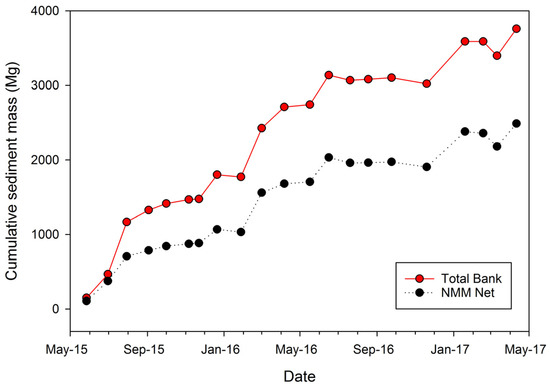 Cumulative mean sediment mass loss for NMM Net and total bank, for the main stem of Walnut Creek, Iowa.