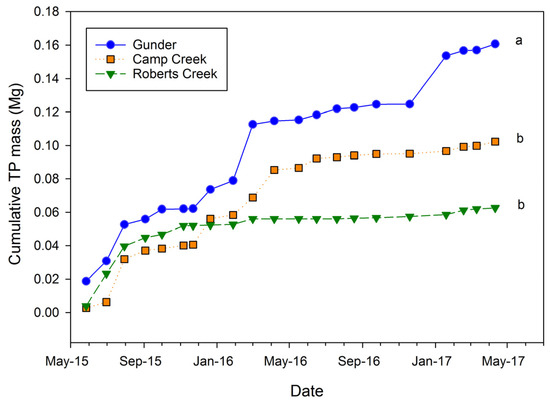 Cumulative mean TP mass loss for Camp Creek, Roberts Creek, and Gunder alluvial units, for the main stem of Walnut Creek, Iowa. Significant differences (p value < 0.1) indicated by differing lower-case letters. Error bars omitted for clarity.