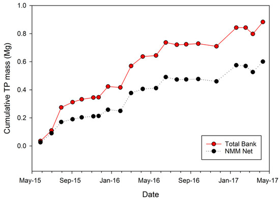 Cumulative mean TP mass loss for NMM Net and total bank, for the main stem of Walnut Creek, Iowa.