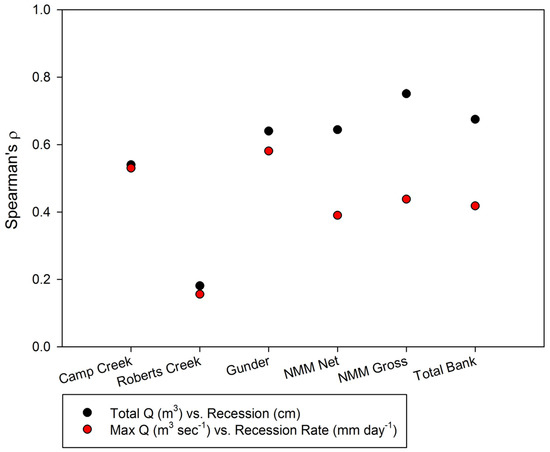 Correlation estimates between total measurement period discharge (m3) and mean period recession (cm) were greater for all members than correlation between maximum measurement period discharge (m3 s−1) and mean period recession rate (mm day−1) (Figure 13). For correlation between total discharge and recession, Gunder exhibited the largest Pearson correlation coefficient (ρ = 0.64, p value = 0.002) as compared with Camp Creek (ρ = 0.54, p value = 0.012) and Roberts Creek (ρ = 0.18, p value = 0.43). Total bank and NMM Net exhibited correlations similar to Gunder (ρ = 0.68, 0.64, respectively, p value = 0.001, 0.002, respectively). NMM Gross recession exhibited the greatest correlation between total discharge of any streambank material (ρ = 0.75, p value = 0.0001).
