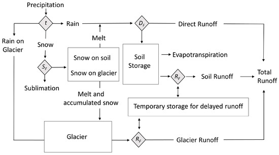 The conceptual water balance model selected for use in this study, the MWBMglacier [29], represents the partitioning of water among snow, glaciers, runoff, soil, and the atmosphere (Figure 2).