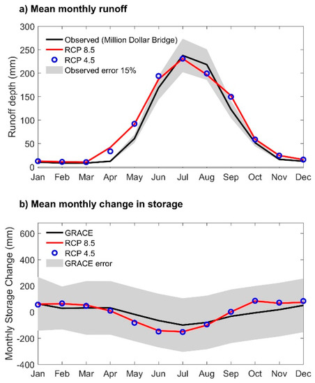 Evaluation of model performance, using mean monthly data for the period 2006–2016, was performed by comparing simulated output from MM45 and MM85 with: (a) runoff at the watershed outlet; and (b) TWS change based on GRACE satellite data. USGS estimates of stream gauge error (15%, see Table 1) are illustrated by gray shading in Figure 3a. Error in GRACE estimates (illustrated by gray shading in Figure 3b) accompanied the data provided by the University of Colorado GRACE Data Portal (listed in Table 1). The reported error associated with individual monthly estimates of total water storage was doubled because the change in monthly storage was calculated for illustration in Figure 3b.