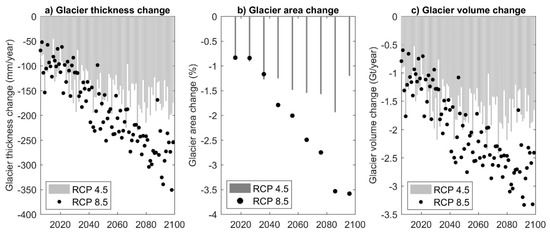 Future changes in glacier: thickness (a); area (b); and volume (c), for RCP 8.5 (MM85) and RCP 4.5 (MM45). The increasingly negative rate of glacier loss is statistically significant for both scenarios (Mann Kendall, p < 0.05).
