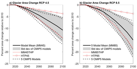 Projected changes in glacierized area based on 8 climate scenarios for: (a) RCP 4.5; and (b) RCP 8.5. The five dashed lines represent results from all CMIP5 models, and the solid black line is based on simulations using climate forcing data from the five-model mean. The red lines with circles represent HTP45 and HTP85 simulations. The red solid lines represent MM45THP and MM85THP simulations. The difference between the two red lines reflects the impact of temperature rise alone. The difference between the solid red line and the solid black line shows the mitigating effect of high winter precipitation on glacier loss. Gray shading illustrates the standard deviation of the five CMIP5 models.