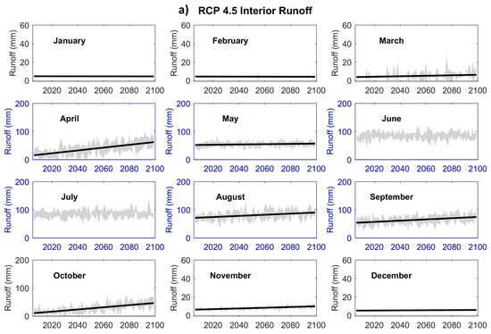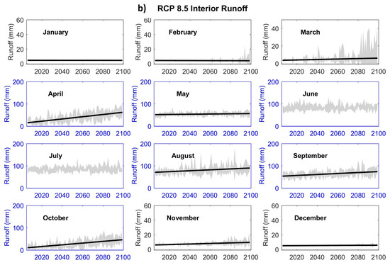 Trends in monthly runoff for scenarios RCP 4.5 (a) and RCP 8.5 (b) from the interior portion of the watershed, which comprises the Alaska Range, the Wrangell Mountains, and the forested river valley. Gray shaded regions display one standard deviation around the mean of five CMIP5 models, and where a solid black trendline is present, it indicates the presence of a statistically significant trend in the five-model mean simulations (MM45 or MM85). Runoff during high-flow months (identified by blue axes) is illustrated at a different scale than during low-flow months (black axes).