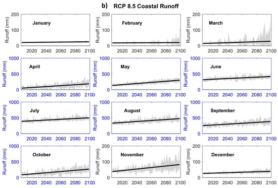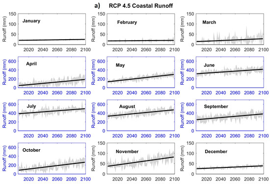 Trends in monthly runoff for scenarios RCP 4.5 (a) and RCP 8.5 (b) from the coastal portion of the watershed, which comprises the Chugach and St. Elias Mountains. Gray shaded regions represent one standard deviation around the mean of five CMIP5 models, and where a solid black trendline is present, it indicates the presence of a statistically significant trend in the five-model mean simulations (MM45 or MM85). Runoff during high-flow months (identified by blue axes) is illustrated at a different scale than during low-flow months (black axes).