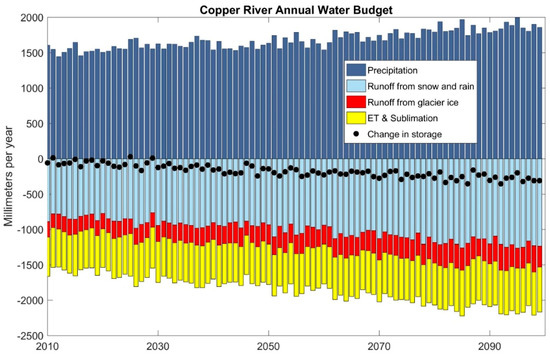 Future water budget from the RCP 8.5 five-model mean simulation. The following components of the water budget increase at a statistically significant rate (p < 0.05): precipitation, runoff from rain and snow melt, runoff from glacier ice melt, and transfers to the atmosphere (ET and sublimation).