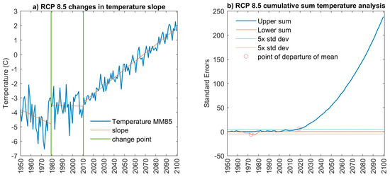 Illustration of temperature regime changes detected in the RCP 8.5 five-model mean (MM85) using: change point visualization (a); and cumulative sum analysis (b).