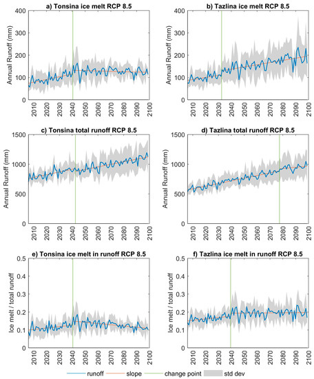 Trends in runoff from glacier ice melt (a,b), total runoff (c,d), and the ratio of ice melt to total runoff in two glacier-fed tributaries in the Chugach Mountains: the Tonsina River gage (left column) and the Tazlina River gage (right column). Results displayed are based on RCP 8.5 five-model mean (MM85), with the standard deviation of individual CMIP5 models shown in gray. In scenario RCP 4.5 (not shown) ice melt from both glaciers stops increasing in mid-Century.