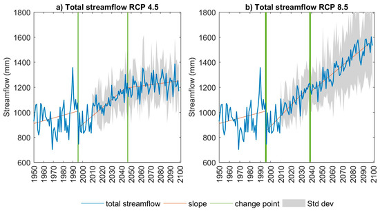 Future trends in total streamflow for RCP 4.5 and RCP 8.5 (MM45 and MM85). Total streamflow is the sum of runoff from all sources. The vertical green lines indicate break points in the slope of total runoff.
