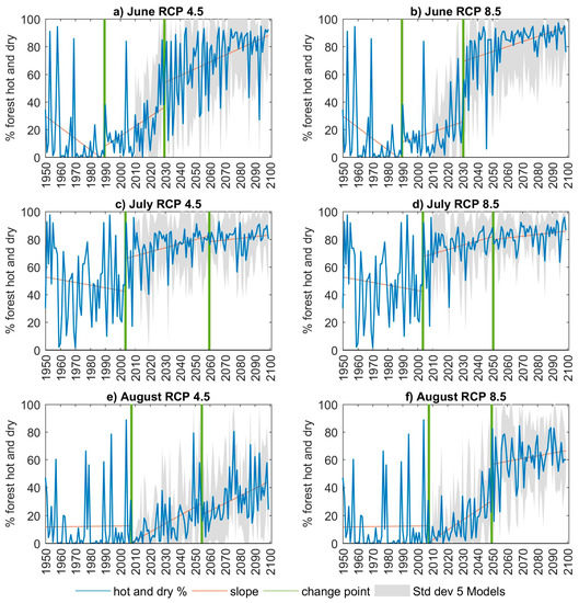 The percentage of forests that are vulnerable (hot and dry) in June, July, and August using historical (1949–2009) and future (2010–2099) climate scenarios. Hot is defined as temperature greater than 13.4 C, and dry is defined as PET > ET. Blue lines show future results for the five-model mean simulations (MM45 and MM85) and gray shading illustrates the standard deviation of the five individual CMIP5 models.