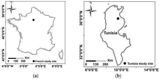 The French study site is the Versailles plain. It is located west of Paris and covers about 221 km2 (48°46′–48°56′ N; 1°50′–2°07′ E, Figure 1) [28]. This agricultural peri-urban site is characterized by a semi-oceanic climate with an average rainfall of 570 mm/year and an average annual temperature of 11.3 °C (INRA meteorological station of Thiverval-Grignon, 1986–2016). Rainfed annual crop systems cover 99 km2 and develop over two embedded plateaus, and also over the gentle slopes at their edges and the valleys at their bottom. The main crop rotations in the area involve winter wheat, winter rapeseed, winter and spring barley and maize on occasion [28]. Conventional tillage practices are used: ploughing in November-December, followed by chisel in March then seedbed preparation for spring cereals (spring barley in March, maize in April). The main cultivated soils according to the The Food and Agriculture Organization of the United Nations (FAO) classification (World Reference Base (WRB) [28] are haplic or glossic luvisols deriving from loessic material over the plateaus, calcaric cambisols deriving from limestones and/or colluvic material and/or chalk along slopes and stagnic colluvic cambisols in the valley bottoms. The topsoil texture is dominated by silt loam (silt > 50%) with extreme textural classes varying from sandy loam to silty clay. The clay content is between 14% and 32% (22% in median). The Tunisian study site is situated in the Kairouan plain, in central Tunisia (35°1′−35°55′ N–9°23′−10°17′ E, Figure 1). The climate in this region is semi-arid Mediterranean, with an average rainfall of approximately 300 mm/year, characterized by a rainy season lasting from October to May, with the two rainiest months being October and March [29]. The study site consists mainly of agricultural fields (cereals) on flat landscape. Soil texture measurements showed a clay percentage between 2.4% and 53.1% and sand percentage between 4.4% and 84.3% [29].