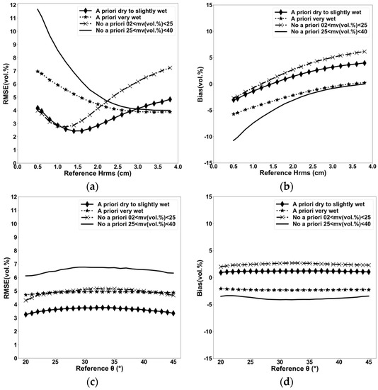 Next, the performance of the algorithm is analyzed according to Hrms and incidence angle “θ” (Figure 2a,b). Results show that the bias (estimated mv–measured mv) and the RMSE are strongly dependent on Hrms. The RMSE of mv in the case of inversion without a priori information on mv increases from 4.0 vol. % for Hrms = 0.5 cm to 7.2 vol. % for Hrms = 3.8 cm for mv between 2 and 25 vol. % (dry to slightly wet soils). Under very wet soil conditions, the RMSE of mv decreases from 11.7 vol. % for Hrms = 0.5 cm to 4.0 vol. % for Hrms = 3.8 cm. The high RMSE values in the case of dry to slightly wet conditions and high Hrms-values are due to an overestimation of mv (bias increases from −2.7 to +6.1 vol. % for Hrms between 0.5 and 3.8 cm). Similarly, the high RMSE values in the case of very wet conditions and low Hrms-values are due to an underestimation of mv (bias increases from −10.5 to 0 vol. % for Hrms between 0.5 and 3.8 cm).