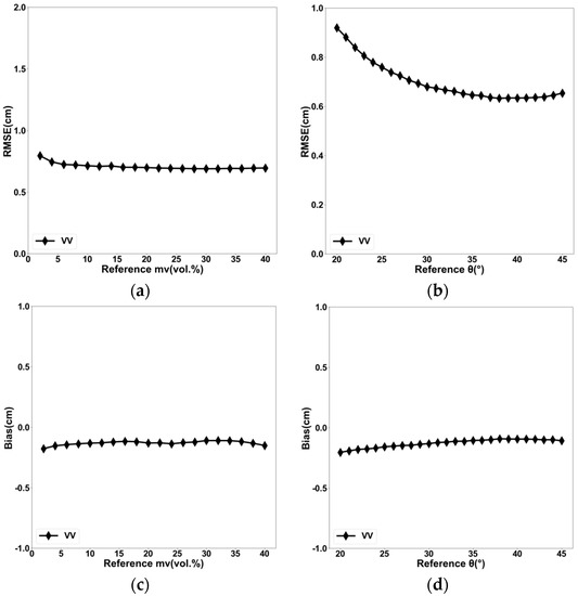 In addition, results show that the RMSE of mv slightly depends on θ in the case of no a priori information on mv (Figure 2c,d). The RMSE is about 4.9 vol. % for dry to slightly wet soil conditions and about 6.5 vol. % for very wet soils. The overestimation of mv in dry to slightly conditions is approximately 2.5 vol. % for θ between 20° and 45°. For very wet soil conditions, the underestimation of mv is about −3.8 vol. % for θ between 20° and 45°.