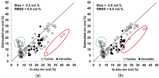In this case, mv is supposed between 2 and 40 vol. %. The RMSE of the mv estimates is of 4.9 vol. % for mv between 2 and 25 vol. % and 6.6 vol. % for mv between 25 and 40 vol. %. An overestimation of 2.4 vol. % on mv is observed for mv between 2 and 25 vol. %, and an underestimation of −3.8 vol. % is obtained for mv between 25 and 40 vol. %. For the entire range of mv, between 2 and 40%, the RMSE of mv is of 5.7 vol. %.